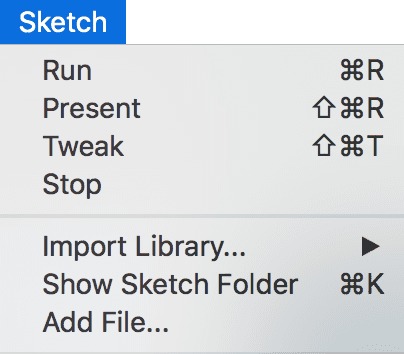 If you don’t want to use the buttons, you can always use the Sketch menu, which reveals the shortcut Ctrl-R (or Cmd-R on the Mac) for Run. The Present option clears the rest of the screen when the program is run to present the sketch all by itself. You can also use Present from the Toolbar by holding down the Shift key as you click the Run button.